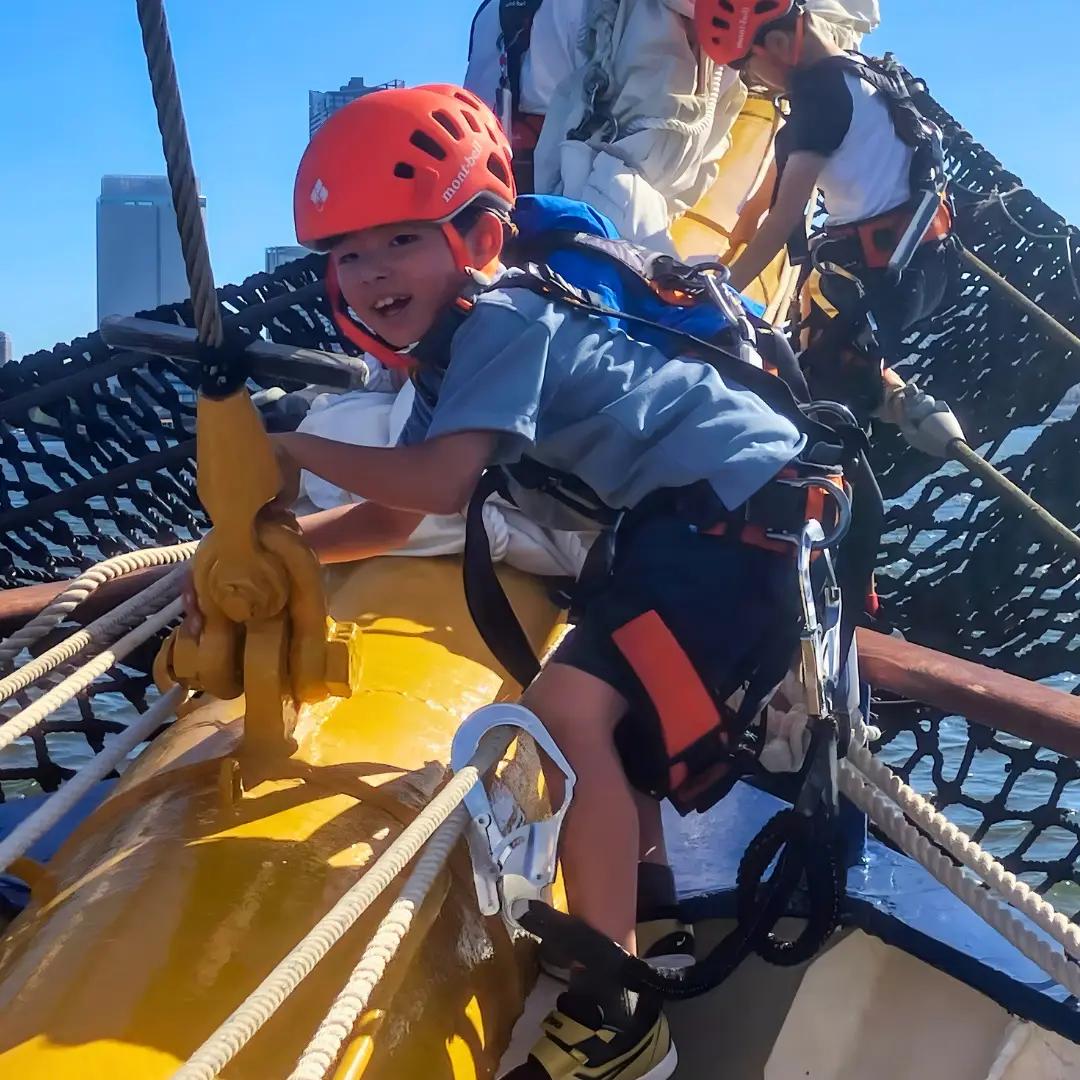 停泊中の船上で実施します。登りの歩幅が必要なため身長の制限を設けております。落下防止のフルハーネスとヘルメットを着用していただきます。動きやすい服装(スカート不可)、脱げにくい運動靴でお越しください。桟橋の安全管理上、一斉入場、一斉退場となります。時間に遅れないようにお集まりください。船上で順番待ちしていただきますのでご了承ください。体験に参加される方のみご乗船いただけます。お申し込みを頂いていない方の付き添いでのご乗船および桟橋への入場はできません。