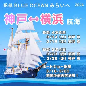 神戸を母港とし、全国各地で体験航海・セイルトレーニング・海洋環境教育を行う帆船「BLUE OCEAN みらいへ」が、「ジャパンインターナショナルボートショー2026」にあわせて、2026年3月19日(木)から22日(日)まで横浜に寄港します。