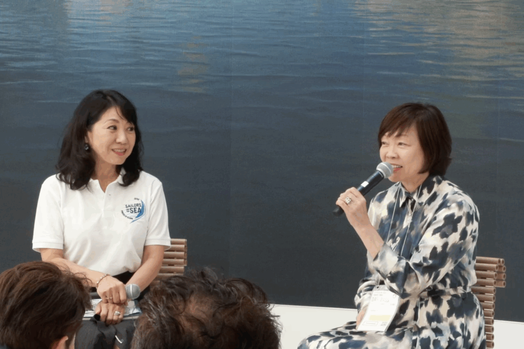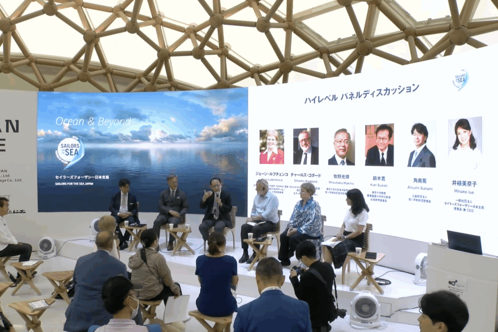 10月12日(日)は、「海のドリームチーム」というべき、海洋に関する世界のトップリーダーを招き、豊かな海を未来の世代へとつないでいくためのトークセッションを開催しました。4時間にわたった講演では、アメリカのセイラーズフォーザシーの創設者で、日本支局の名誉会長でもあるデイビッド・ロックフェラー Jr.ご夫妻によるビデオメッセージ公開に始まり、セイラーズフォーザシー日本支局理事長 井植氏と、世界のトップリーダーのインタビューを実施。オレゴン州立大学特別教授で、元米国商務省海洋大気庁(NOAA)長官、オバマ大統領初代科学チームを歴任したジェーン・ルブチェンコ氏、World Ocean Summit創設者でEconomist Impact エディトリアルダイレクターのチャールズ・ゴダード氏、東京大学大気海洋研究所教授で笹川平和財団海洋政策研究所所長の牧野 光琢氏、東京大学教授ならびに慶應義塾大学特任教授の鈴木 寛氏、公益財団法人笹川平和財団理事長 角南 篤氏とそれぞれ特別な対談を行いました。