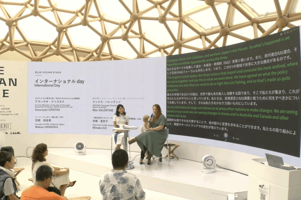 10月7日(火)は、一般社団法人セイラーズフォーザシー日本支局理事長兼CEOの井植 美奈子氏がモデレーターを務め、元ポルトガル海洋大臣でNOVA School of Law准教授のアスンサオ・クリスタス氏、米国の海洋NGO「OCEANA」のキャンペーンディレクター兼シニアサイエンティストのマックス・バレンティン氏、シーフードレガシー創立者兼CEOの花岡 和佳男氏と、対談及びトークセッションを行いました。ポルトガルやアメリカが直面する海洋問題、日本の水産業の課題についてや、IUU(違法・無報告・無規制)漁業対策についての議論を交わし、あらゆる人が海に関心を持ち、課題を解決していくことが必要であると伝えました。