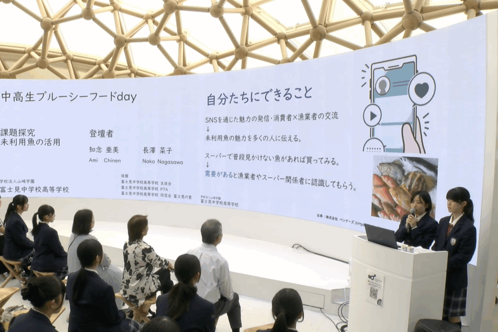 10月9日(木)は、ブルーシーフード・パートナーである山崎学園富士見中学校高等学校の現役学生が、ブルーシーフードの研究発表を行いました。発表は3部門に分けて行われ、『学術探究』の部門では「海洋保全とブルーシーフード」「持続可能な漁業と認証制度」というテーマについて、『課題探究』の部門では「おいしい未来を生きるために ~東京都のブルーシーフードへの取り組み~」「未利用魚の活用」「持続可能なレストラン選び」「魚を食べる! その一皿が未来を変える」というテーマについて、『実践探究』では中高生が考えたブルーシーフードを利用した食事メニューについて、発表を行いました。